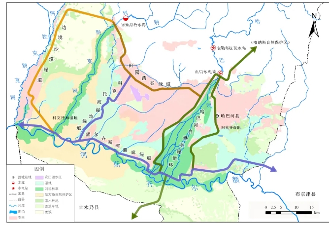 结合典型生态景观分布与交通设施布局,选取5条特色游憩路径形成生态绿道的空间布局:哈巴河白桦林绿道环路,展现沿岸河谷林草生境;额尔齐斯河画廊绿道,展现河谷林草与干旱草原灌丛交替的景观;科克托海湿地绿道,展现沼泽湿地与干旱草原灌丛交替的景观;田园药谷绿道,展现农业(中草药)生产景观及乡村风光;边境沙漠绿道,展现中哈界河和独特的大漠自然风光。