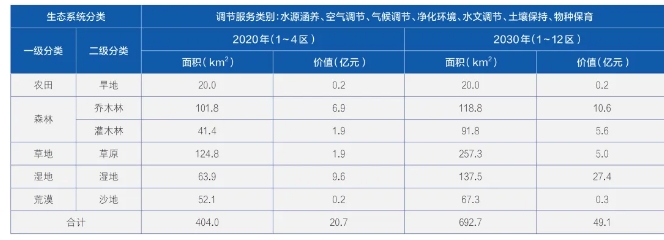 ▲哈巴河县2020年和2030年生态系统调节服务价值