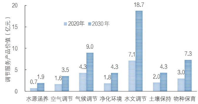 结合生态保护目标,将湿地生态空间由400km²扩展到700km²,扩大补水范围,采取退耕、补植、增湿、增加生态用水、控制放牧等措施,提升生态系统调节服务价值。其中,与2020年相比,2030年乔木林面积增加17.0km²,灌木林面积增加50.4km²,草地面积增加132.5km²,湿地面积增加73.6km²。生态系统调节服务价值由2020年的20.7亿元,提高到2030年的49.1亿元。