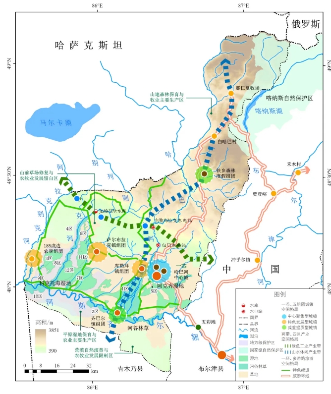 一方面在空间上要强化对“一山(阿尔泰山)、两湿(阿克齐湿地、科克托海湿地)、四河(额尔齐斯河、哈巴河、别列则克河、阿拉克别克河)”核心生态区的保护,维护“山河林田湿草沙”多样化生境;另一方面要合理利用生态资源,以生态城镇化建设为引擎,推进“一芯、五组团”建设,以生态产业为链条,加快“两带、四片区”发展,以生态旅游为触媒,增加“一环、多游路”活力,让生态成为经济发展的永续能源。